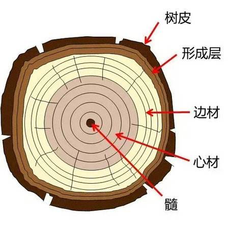 從橫切面觀察,在髓心周圍,顏色較深,含水量少的部分,稱為心材;靠近樹皮部分,顏色較淺,含水量多的部分,稱為邊材。
