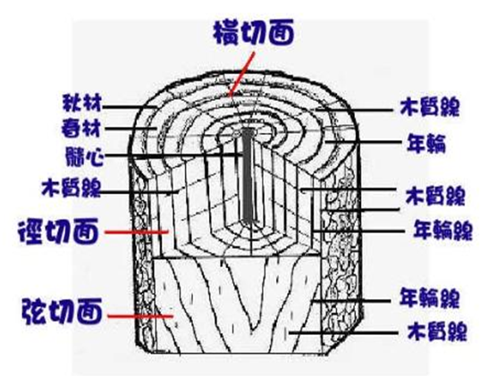 1) 橫切面:與樹干主軸相垂直的切面稱為橫切面。除年輪之外,木材紋理的特征都暴露在這個切面上,橫切面是識別木材比較重要的切面,這個切面硬度大、耐磨損,可做鋪路木塊。